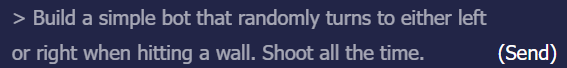 Building your first battle bot is easy. Instruct an AI agent to create a bot for you or build it from a few blocks in Blockly. Bots are coded with easy command like move(), shoot() or sensing walls and other enemy bots. An AI gents helps putting this together.